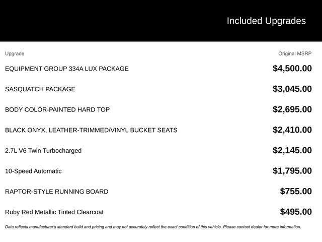 WE DELIVER ANYWHERE, 4-Wheel Disc Brakes, 4.7 Axle Ratio, 7 Speakers, ABS brakes, Air Conditioning, Alloy wheels, AM/FM radio: SiriusXM with 360L, AM/FM Stereo, Auto High-beam Headlights, Auto-dimming Rear-View mirror, Brake assist, Compass, Delay-off headlights, Driver door bin, Driver vanity mirror, Dual front impact airbags, Dual front side impact airbags, Electronic Stability Control, Emergency communication system: 911 Assist, Exterior Parking Camera Rear, Front anti-roll bar, Front Bucket Seats, Front Center Armrest, Front fog lights, Front reading lights, Front wheel independent suspension, Fully automatic headlights, Heated door mirrors, Heated front seats, Heated steering wheel, Illuminated entry, Integrated roll-over protection, Leather Shift Knob, Low tire pressure warning, Marine Grade Vinyl Heated Bucket Seats, Occupant sensing airbag, Outside temperature display, Overhead airbag, Overhead console, Panic alarm, Passenger door bin, Passenger vanity mirror, Power door mirrors, Power steering, Power windows, Radio data system, Remote keyless entry, Security system, SiriusXM w/360L, Speed control, Split folding rear seat, Steering wheel mounted audio controls, SYNC 4, Tachometer, Telescoping steering wheel, Tilt steering wheel, Traction control, Trip computer, Variably intermittent wipers, Voltmeter, Wheels: 17 Carbonized Gray-Painted Aluminum.