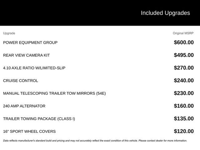 WE DELIVER ANYWHERE, 110V Power Inverter, 2 Speakers, 240 Amp Alternator, 4-Wheel Disc Brakes, 4.10 Axle Ratio, ABS brakes, Air Conditioning, AM/FM radio, Chrome Grille, Class I Trailer Towing Package, Cruise Control, Driver door bin, Driver's Seat Mounted Armrest, Dual front impact airbags, Dual High Back Buckets, Electronic Stability Control, Engine Block Heater, Frame Pucks (Isolators), Front anti-roll bar, Front Bucket Seats, Front Chrome Bumper, Front wheel independent suspension, Fully automatic headlights, High Series Exterior Upgrade Package, License Plate Bracket, Order Code 780A, Passenger door bin, Passenger seat mounted armrest, Power Equipment Group, Power steering, Radio: AM/FM Stereo w/Clock Display & 2 Speakers, Rear View Camera Kit, Remote Keyless Entry, Tachometer, Tamper Proof Odometer, Telescoping steering wheel, Tilt steering wheel, Traction control, User-Defined Switches, Variably intermittent wipers, Vinyl Bucket Seats, Vinyl Floor Covering, Voltmeter.