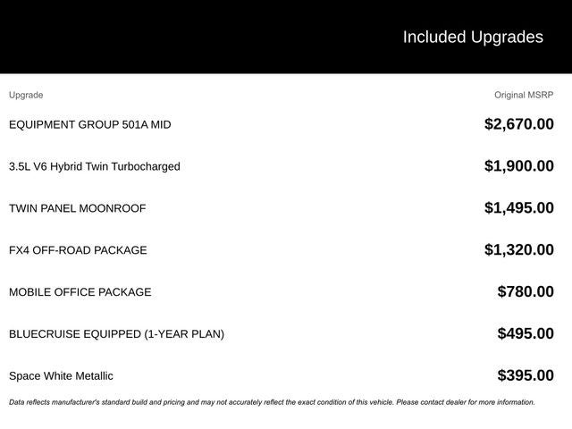Designed with your needs in mind, the Mobile Office Package transforms this truck into a mobile command center, complete with wireless charging and a partitioned lockable rear storage area. Stay connected and productive on the go with the SYNC 4 infotainment system and BlueCruise hands-free driving technology.