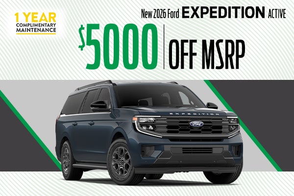 Ex: 2026 Ford Expedition Active. VIN: 1FMJU1H87TEA23190. MSRP $70,065. Offer includes: $5,000 Dealer Discount. Not all will qualify. On select models. 3 in stock at this price. One year of complimentary maintenance includes one oil change and one tire rotation. Good on select new and used vehicles. See the dealer of complete maintenance details. Advertised Price EXCLUDES all optional dealer offered items, accessories, or product addendums optionally selected by the purchaser, applicable official taxes and fees, and a $436 documentary fee. See dealer for details. Offer Expires 04/30/2026.
