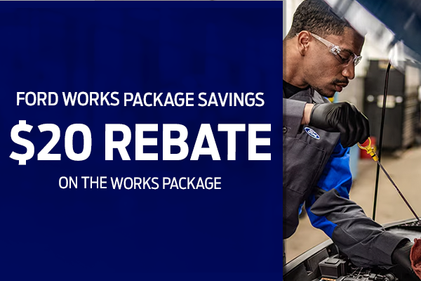Plus tax and applicable fees. Rebate provided by Ford; restrictions apply. Valid on qualifying Works Package services. See Ford rebate terms for eligibility and submission requirements. May not be combined with any other offer. Must present coupon at time of service. Offer Expires 03/31/2026.