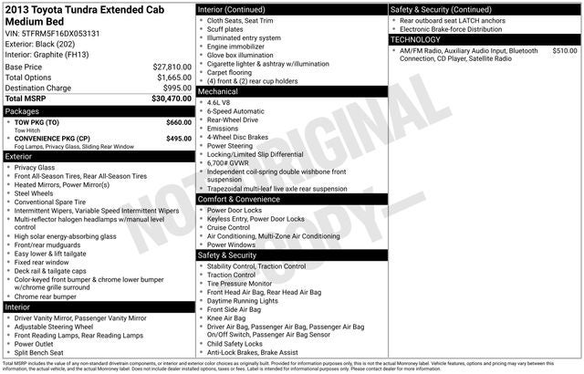 Black 2013 Toyota Tundra Grade 4.6L V8 RWD 6-Speed Automatic Electronic with Overdrive 4.6L V8 DOHC 32V VVT-i WE DELIVER ANYWHERE, Black w/Fabric Seat Trim or Fabric Seat Trim w/SR5 Package or Fabric Seat Trim w/Off-Road & SR5 Package or Fabric Seat Trim w/Rock Warrior Special Edition or Fabric Seat Trim w/Chrome Appearance Package or Fabric Seat Trim w/Chrome Appearance & SR5 Package, 170-Amp Alternator, 2-Box Over-Head Console, 4.10 Rear Differential, Clear Front Fog & Driving Lights, Fabric Seat Trim w/SR5 Package, Power Bucket Seats, Power Sliding Rear Window w/Privacy Glass, Rear Underseat Storage Tray, SR5 Badge, SR5 Package, Supplemental Transmission Cooler, Tow Package, 18 x 8J Styled Steel Wheels, 3-Passenger Front Bench Seat, 3.909 Axle Ratio, 4-Wheel Disc Brakes, 6 Speakers, ABS brakes, Air Conditioning, AM/FM radio, AM/FM w/CD Player, Brake assist, Bumpers: chrome, CD player, Driver door bin, Driver vanity mirror, Dual front impact airbags, Dual front side impact airbags, Electronic Stability Control, Fabric Seat Trim, Front anti-roll bar, Front Center Armrest w/Storage, Front dual zone A/C, Front reading lights, Front wheel independent suspension, Heated door mirrors, Illuminated entry, Knee airbag, Low tire pressure warning, Occupant sensing airbag, Outside temperature display, Overhead airbag, Overhead console, Panic alarm, Passenger door bin, Passenger vanity mirror, Power door mirrors, Power steering, Power windows, Rear reading lights, Rear step bumper, Remote keyless entry, Speed control, Speed-sensing steering, Split folding rear seat, Tachometer, Tilt steering wheel, Traction control, Variably intermittent wipers, Voltmeter, Black w/Fabric Seat Trim or Fabric Seat Trim w/SR5 Package or Fabric Seat Trim w/Off-Road & SR5 Package or Fabric Seat Trim w/Rock Warrior Special Edition or Fabric Seat Trim w/Chrome Appearance Package or Fabric Seat Trim w/Chrome Appearance & SR5 Package, 170-Amp Alternator, 2-Box Over-Head Console, 4.10 Rear Differential, Clear Front Fog & Driving Lights, Fabric Seat Trim w/SR5 Package, Power Bucket Seats, Power Sliding Rear Window w/Privacy Glass, Rear Underseat Storage Tray, SR5 Badge, SR5 Package, Supplemental Transmission Cooler, Tow Package.