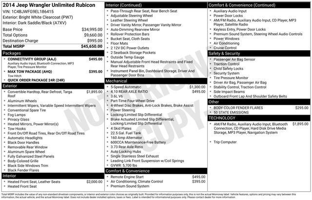 1-Year SIRIUSXM Traffic Service, 1-Year SIRIUSXM Travel Link Service, 17 x 7.5 Polished Mineral Gray Wheels, 4-Wheel Disc Brakes, 40GB Hard Drive w/20GB Available, 7 Speakers, ABS brakes, Air Conditioning, Air Conditioning w/Auto Temperature Control, Air Filtering, Alloy wheels, AM/FM radio, Audio Jack Input for Mobile Devices, Auto-dimming Rear-View mirror, Body Color Fender Flares, Brake assist, CD player, Class II Receiver Hitch, Cloth Bucket Seats, Compass, Connectivity Group, Delete Sunrider Soft Top, Driver door bin, Driver vanity mirror, Dual front impact airbags, Electronic Stability Control, Freedom Panel Storage Bag, Front anti-roll bar, Front Bucket Seats, Front Center Armrest w/Storage, Front fog lights, Front reading lights, Fully automatic headlights, Heated door mirrors, Heated Front Seats, Illuminated entry, Integrated roll-over protection, Integrated Voice Command w/Bluetooth®, Leather steering wheel, Low tire pressure warning, Max Tow Package, MOPAR Premium Sound & Leather, Occupant sensing airbag, Outside temperature display, Panic alarm, Passenger door bin, Passenger vanity mirror, Performance Suspension, Power door mirrors, Power steering, Power windows, Quick Order Package 24R, Radio data system, Radio: Uconnect 130 AM/FM/CD/MP3, Radio: Uconnect 730N CD/DVD/MP3/HDD/NAV, Rear anti-roll bar, Rear Window Defroster, Rear Window Wiper/Washer, Remote keyless entry, Remote Start System, Remote USB Port, Security system, SIRIUSXM Traffic, SIRIUSXM Travel Link, Speed control, Split folding rear seat, Steering wheel mounted audio controls, Tachometer, Tilt steering wheel, Tire Pressure Monitoring Display, Traction control, Trailer Tow w/4-Pin Connector Wiring, Trip computer, Uconnect Voice Command w/Bluetooth®, Variably intermittent wipers, Vehicle Information Center.