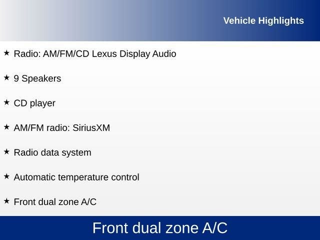 • Radio: AM/FM/CD Lexus Display Audio -inc: 8-inch screen, 9-speaker premium audio system, Bluetooth® hands free phone and automatic phonebook download capabilities, Scout GPS link app-based turn-by-turn directions, voice recognition, Cache Radio, ability to pause live AM/FM radio and HD Radio, traffic and weather data provided via HD Radio (free to all users while in HD Radio range), basic traffic map, weather forecast, Siri Eyes Free and Electro Multi Vision (EMV) display