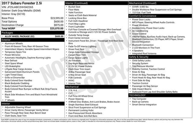 Priced below KBB Fair Purchase Price! Dark Gray Metallic 2017 Subaru Forester 2.5i AWD Lineartronic CVT 2.5L 4-Cylinder DOHC 16V VVT 17 Machine-Finished Alloy Wheels, 3.70 Axle Ratio, 4 Speakers, 4-Wheel Disc Brakes, ABS brakes, Air Conditioning, Alloy Wheel Package, AM/FM radio, Black Finish Roof Rails, Brake assist, Bumpers: body-color, CD player, Cloth Upholstery, Driver door bin, Driver vanity mirror, Dual front impact airbags, Dual front side impact airbags, Electronic Stability Control, Emergency communication system: STARLINK, Exterior Parking Camera Rear, Four wheel independent suspension, Front anti-roll bar, Front Bucket Seats, Front Center Armrest, Front reading lights, Illuminated entry, Knee airbag, Low tire pressure warning, Occupant sensing airbag, Outside temperature display, Overhead airbag, Overhead console, Panic alarm, Passenger door bin, Passenger vanity mirror, Power door mirrors, Power steering, Power windows, Radio data system, Radio: Subaru Starlink 6.2 Multimedia System, Rear anti-roll bar, Rear window defroster, Rear window wiper, Remote keyless entry, Security system, Speed control, Split folding rear seat, Steering wheel mounted audio controls, Tachometer, Telescoping steering wheel, Tilt steering wheel, Traction control, Trip computer, Variably intermittent wipers, Wheels: 17 Steel w/Center Cap.