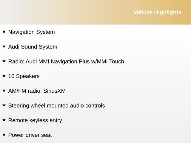 10 Speakers, AM/FM radio: SiriusXM, Audi Connect w/Online Services, Audi Sound System, Four wheel independent suspension, Heated Front Seats, Leather Seating Surfaces, Navigation System, Power door mirrors, Power driver seat, Power passenger seat, Radio: Audi MMI Navigation Plus w/MMI Touch, Remote keyless entry, Speed-sensing steering, Steering wheel mounted audio controls, USB Audi Music Interface, Wheels: 18 10-V-Spoke-Design, 4-Wheel Disc Brakes, ABS brakes, Air Conditioning, Alloy wheels, Anti-whiplash front head restraints, Auto-dimming door mirrors, Auto-dimming Rear-View mirror, Automatic temperature control, Brake assist, Bumpers: body-color, CD player, Compass, Delay-off headlights, Driver door bin, Driver vanity mirror, Dual front impact airbags, Dual front side impact airbags, Electronic Stability Control, Exterior Parking Camera Rear, Front anti-roll bar, Front Bucket Seats, Front Center Armrest w/Storage, Front dual zone A/C, Front fog lights, Front reading lights, Garage door transmitter: HomeLink, Genuine wood console insert, Genuine wood dashboard insert, Genuine wood door panel insert, Heated door mirrors, Heated front seats, High intensity discharge headlights: Bi-xenon, HVAC memory, Illuminated entry, Knee airbag, Leather Shift Knob, Leather steering wheel, Low tire pressure warning, Memory seat, Occupant sensing airbag, Outside temperature display, Overhead airbag, Panic alarm, Passenger door bin, Passenger vanity mirror, Power moonroof, Power steering, Power windows, Radio data system, Rain sensing wipers, Rear air conditioning, Rear anti-roll bar, Rear fog lights, Rear reading lights, Rear seat center armrest, Rear window defroster, Security system, Speed control, Speed-Sensitive Wipers, Split folding rear seat, Tachometer, Telescoping steering wheel, Tilt steering wheel, Traction control, Trip computer, Turn signal indicator mirrors, Variably intermittent wipers, 10 Speakers, AM/FM radio: SiriusXM, Audi Connect w/Online Services, Audi Sound System, Four wheel independent suspension, Heated Front Seats, Leather Seating Surfaces, Navigation System, Power door mirrors, Power driver seat, Power passenger seat, Radio: Audi MMI Navigation Plus w/MMI Touch, Remote keyless entry, Speed-sensing steering, Steering wheel mounted audio controls, USB Audi Music Interface, Wheels: 18 10-V-Spoke-Design.