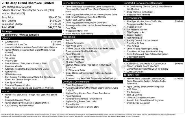 1-Year SiriusXM Guardian Trial, 230MM Rear Axle, 3.27 Rear Axle Ratio, 4-Wheel Disc Brakes, 5-Year SiriusXM Traffic Service, 5-Year SiriusXM Travel Link Service, 506 Watt Amplifier, 6 Speakers, 8.4 Touchscreen Display, 9 Amplified Speakers w/Subwoofer, ABS brakes, Active Noise Control System, Air Conditioning, Alloy wheels, AM/FM radio: SiriusXM, Anti-whiplash front head restraints, Apple CarPlay, Apple CarPlay/Android Auto, Audio memory, Auto-dimming door mirrors, Auto-Dimming Exterior Passenger Mirror, Auto-dimming Rear-View mirror, Automatic temperature control, Blind Spot & Cross Path Detection, Brake assist, Bumpers: body-color, Chrome Exterior Mirrors, Compass, Delay-off headlights, Driver door bin, Driver vanity mirror, Dual front impact airbags, Dual front side impact airbags, Eco Suspension I, Electronic Stability Control, Engine Oil Cooler, For Details Visit DriveUconnect.com, Four wheel independent suspension, Front anti-roll bar, Front Bucket Seats, Front Center Armrest w/Storage, Front dual zone A/C, Front fog lights, Front License Plate Bracket, Front reading lights, Fully automatic headlights, Garage door transmitter, Google Android Auto, GPS Antenna Input, GPS Navigation, HD Radio, Heated door mirrors, Heated front seats, Heated rear seats, Heated steering wheel, Illuminated entry, Integrated Voice Command w/Bluetooth®, Knee airbag, Leather Shift Knob, Leather Trimmed Bucket Seats, Low tire pressure warning, Manufacturer's Statement of Origin, Memory seat, Occupant sensing airbag, Outside temperature display, Overhead airbag, Overhead console, Panic alarm, ParkView Rear Back-Up Camera, Passenger door bin, Passenger vanity mirror, Power door mirrors, Power driver seat, Power Liftgate, Power passenger seat, Power steering, Power Sunroof (DISC), Power windows, Quick Order Package 2BH, Radio data system, Radio: Uconnect 4 w/7 Display, Radio: Uconnect 4C Nav w/8.4 Display, Rear anti-roll bar, Rear Parking Sensors, Rear reading lights, Rear seat center armrest, Rear window defroster, Rear window wiper, Remote keyless entry, Roof rack: rails only, Security system, SiriusXM Traffic Plus, SiriusXM Travel Link, Speed control, Speed-Sensitive Wipers, Split folding rear seat, Spoiler, Steering wheel mounted audio controls, Tachometer, Telescoping steering wheel, Tilt steering wheel, Traction control, Trip computer, Turn signal indicator mirrors, USB Host Flip, Variably intermittent wipers, Wheels: 18 x 8.0 Tech Gray Aluminum.
