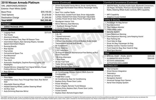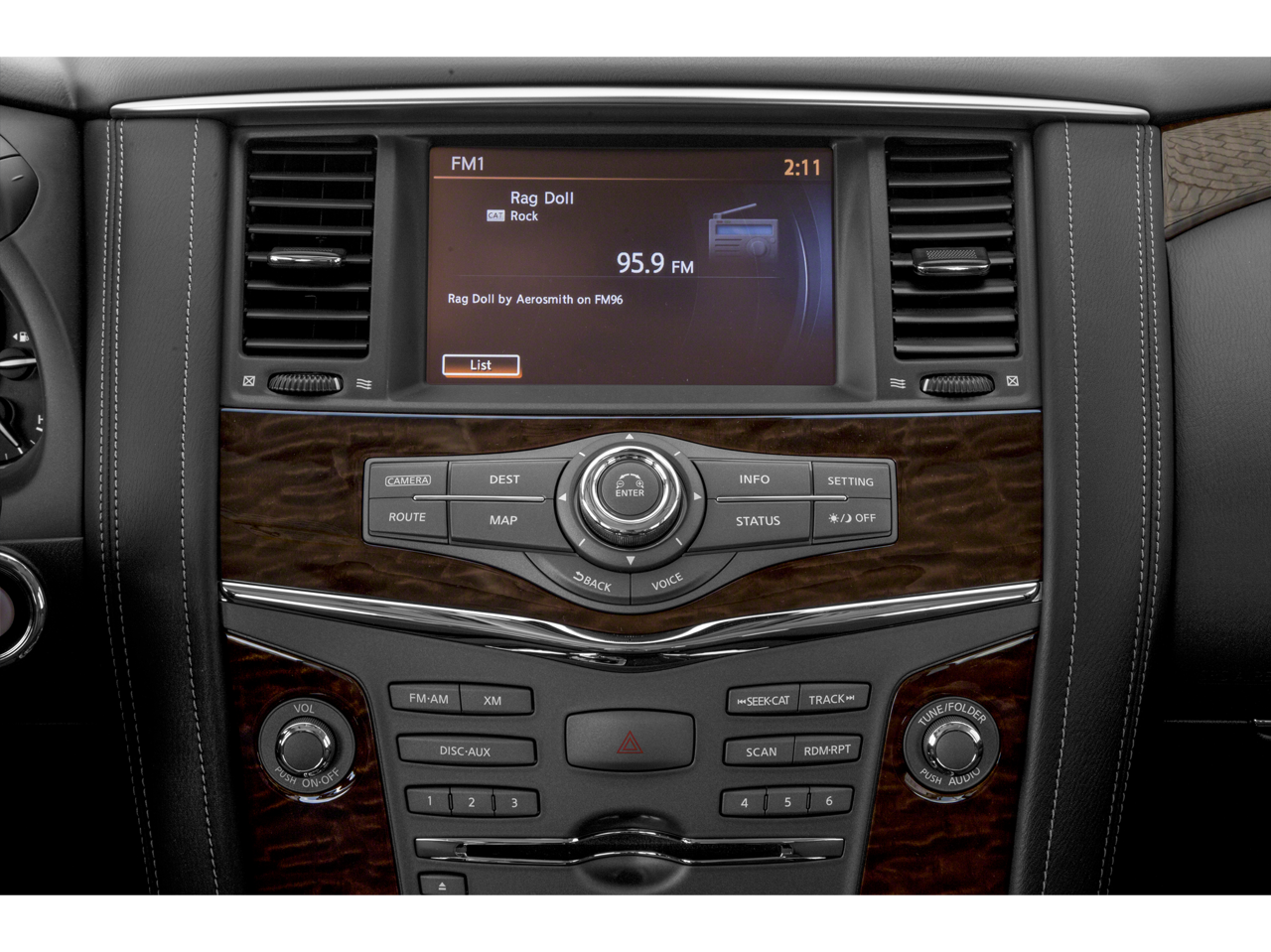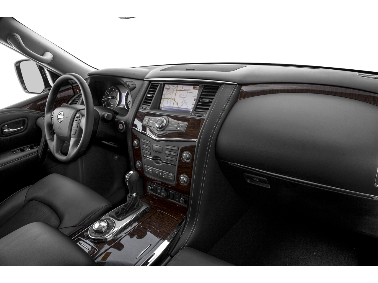 13 Speakers, 2.937 Axle Ratio, 3rd row seats: split-bench, 4-Wheel Disc Brakes, A/V remote, ABS brakes, Air Conditioning, Alloy wheels, AM/FM radio: SiriusXM, Anti-whiplash front head restraints, Auto tilt-away steering wheel, Auto-dimming door mirrors, Auto-dimming Rear-View mirror, Auto-leveling suspension, Automatic temperature control, Brake assist, Bumpers: body-color, CD player, Delay-off headlights, Driver door bin, Driver vanity mirror, Dual front impact airbags, Dual front side impact airbags, Electronic Stability Control, Emergency communication system: NissanConnect Services, Four wheel independent suspension, Front anti-roll bar, Front Bucket Seats, Front Center Armrest, Front dual zone A/C, Front fog lights, Front reading lights, Fully automatic headlights, Garage door transmitter: HomeLink, Headphones, Heated & Cooled Front Bucket Seats w/Driver Memory, Heated door mirrors, HEATED FRONT SEATS, Heated rear seats, Heated steering wheel, Illuminated entry, Lane Departure Warning System, Leather Shift Knob, Leather-Appointed Seat Trim, Low tire pressure warning, Memory seat, NAVIGATION, Occupant sensing airbag, Outside temperature display, Overhead airbag, Overhead console, Panic alarm, Passenger door bin, Passenger vanity mirror, Power door mirrors, Power driver seat, Power Liftgate, Power moonroof, Power passenger seat, Power steering, Power windows, Radio data system, Radio: Bose AM/FM/SXM/CD/MP3/HD Radio, Rain sensing wipers, Rear air conditioning, Rear anti-roll bar, Rear reading lights, Rear seat center armrest, Rear window defroster, Rear window wiper, Reclining 3rd row seat, Remote keyless entry, Roof rack: rails only, Security system, Speed control, Speed-sensing steering, Speed-Sensitive Wipers, Split folding rear seat, Spoiler, Steering wheel memory, Steering wheel mounted audio controls, Tachometer, Telescoping steering wheel, Tilt steering wheel, Traction control, Trip computer, Turn signal indicator mirrors, Variably intermittent wipers, Ventilated front seats, Voltmeter, Wheels: 20 Machine-Faced Chrome w/Tinted CC.
