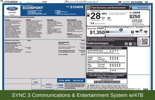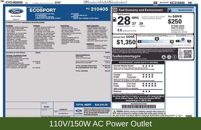Powered by the EcoBoost 1.0L I3 turbocharged engine, the EcoSport SE delivers an impressive 27 city / 29 highway mpg, ensuring you can navigate the city with confidence and efficiency. The 6-speed automatic transmission and front-wheel-drive configuration provide a smooth and responsive driving experience, while the available all-wheel-drive system offers added traction and control when you need it.