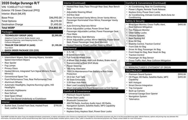 F8 Green Clearcoat 2020 Dodge Durango R/T HEMI 5.7L V8 Multi Displacement VVT 8-Speed Automatic AWD