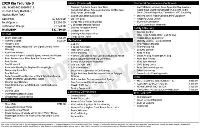 Ebony Black 2020 Kia Telluride S FWD 8-Speed Automatic 3.8L V6 DGI DOHC Dual CVVT 3.648 Axle Ratio, 3rd row seats: split-bench, 4-Wheel Disc Brakes, 6 Speakers, ABS brakes, Air Conditioning, Alloy wheels, AM/FM radio: SiriusXM, Apple CarPlay & Android Auto, Brake assist, Bumpers: body-color, Cargo Mat w/Seatback Protection, Carpeted Floor Mats, Delay-off headlights, Driver door bin, Driver vanity mirror, Dual front impact airbags, Dual front side impact airbags, Electronic Stability Control, Emergency communication system: 911 Connect, Four wheel independent suspension, Front anti-roll bar, Front Bucket Seats, Front Center Armrest, Front reading lights, Fully automatic headlights, Heated door mirrors, Heated Front Bucket Seats, Heated front seats, Illuminated entry, Illuminated Scuff Plates, Knee airbag, Leather Shift Knob, Leather steering wheel, Low tire pressure warning, Multi Colored Interior Light Kit, Occupant sensing airbag, Outside temperature display, Overhead airbag, Overhead console, Panic alarm, Passenger door bin, Passenger vanity mirror, Power door mirrors, Power driver seat, Power moonroof, Power steering, Power windows, Radio data system, Radio: AM/FM/MP3/SiriusXM Audio System, Rear air conditioning, Rear anti-roll bar, Rear Bumper Protector, Rear reading lights, Rear window defroster, Rear window wiper, Reclining 3rd row seat, Remote keyless entry, Roof rack: rails only, Security system, Side Step Bars, SOFINO Artificial Leather Upholstery, Speed control, Speed-sensing steering, Split folding rear seat, Spoiler, Steering wheel mounted audio controls, Tachometer, Telescoping steering wheel, Tilt steering wheel, Traction control, Trip computer, Turn signal indicator mirrors, Variably intermittent wipers, Wheels: 7.5 x 20 Machined Finish Alloy.