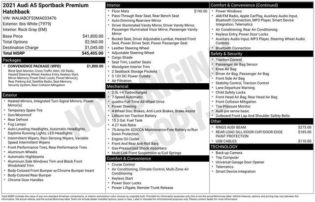 Clean CARFAX. Ibis White 2021 Audi A5 quattro quattro 7-Speed Automatic S tronic 2.0L 4-Cylinder TFSI 10 Speakers, 4-Wheel Disc Brakes, A5 Logo Audi Guard All-Weather Floor Mats, ABS brakes, Air Conditioning, Alarm System w/Motion Sensors, Alloy wheels, AM/FM radio, Anti-whiplash front head restraints, Audi Advanced Key, Audi Side Assist w/Pre Sense Rear, Audi smartphone interface with Apple CarPlay, Auto High-beam Headlights, Auto-Dimming Exterior Mirrors, Auto-dimming Rear-View mirror, Automatic temperature control, Brake assist, Bumpers: body-color, Compass, Convenience Package, Delay-off headlights, Driver door bin, Driver Seat Memory, Driver vanity mirror, Dual front impact airbags, Dual front side impact airbags, Electronic Stability Control, Emergency communication system: Audi connect CARE, Exterior Parking Camera Rear, Four wheel independent suspension, Front anti-roll bar, Front Bucket Seats, Front Center Armrest, Front dual zone A/C, Front fog lights, Front reading lights, Garage door transmitter: HomeLink, Gray Oak Natural Wood Inlays, Heated door mirrors, Heated front seats, Heated Front Sport Seats, Heated Steering Wheel, Illuminated entry, Knee airbag, Leather Seating Surfaces, Leather Shift Knob, Leather steering wheel, Low tire pressure warning, Occupant sensing airbag, Outside temperature display, Overhead airbag, Overhead console, Panic alarm, Parking System Plus (Front/Rear Acoustic Sensors), Passenger door bin, Passenger vanity mirror, Power adjustable front head restraints, Power door mirrors, Power driver seat, Power Liftgate, Power moonroof, Power passenger seat, Power steering, Power windows, Radio data system, Radio: Audi Sound System, Rain sensing wipers, Rear air conditioning, Rear anti-roll bar, Rear Load Sill/Door Cup/Door Edge Paint Protection, Rear reading lights, Rear seat center armrest, Rear window defroster, Remote keyless entry, Rings Audi Beam, SiriusXM All Access Service, Speed control, Speed-sensing steering, Speed-Sensitive Wipers, Split folding rear seat, Steering wheel mounted audio controls, Tachometer, Telescoping steering wheel, Tilt steering wheel, Traction control, Trip computer, Turn signal indicator mirrors, USB Cables, Variably intermittent wipers, Wheels: 18 5-V-Spoke-Y Design.