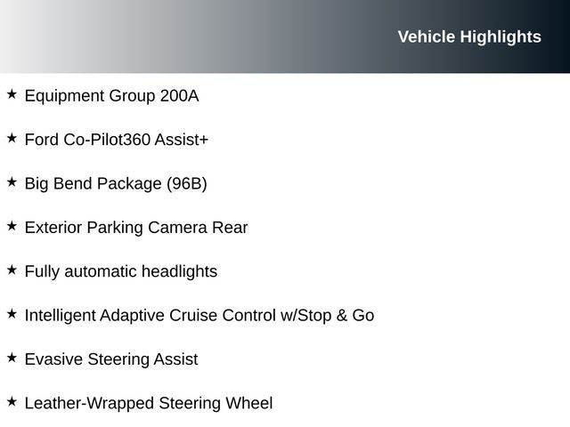 Big Bend Package (96B), Equipment Group 200A, Evasive Steering Assist, Exterior Parking Camera Rear, Ford Co-Pilot360 Assist+, Fully automatic headlights, Heated Front Bucket Seats, Intelligent Adaptive Cruise Control w/Stop & Go, Leather-Wrapped Steering Wheel, Reverse Sensing System, Voice-Activated Touchscreen Navigation System, Wireless Charging Pad.