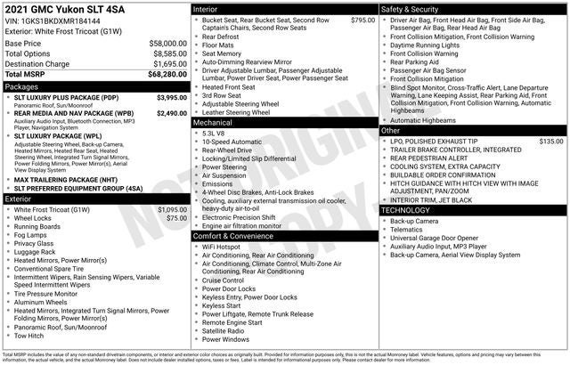 With its striking White Frost Tricoat exterior and well-appointed interior, this 2021 GMC Yukon SLT is a true standout in its class. Experience the pinnacle of full-size SUV luxury and capability. Visit our showroom today to take this exceptional Yukon for a test drive and discover how it can elevate your driving experience.