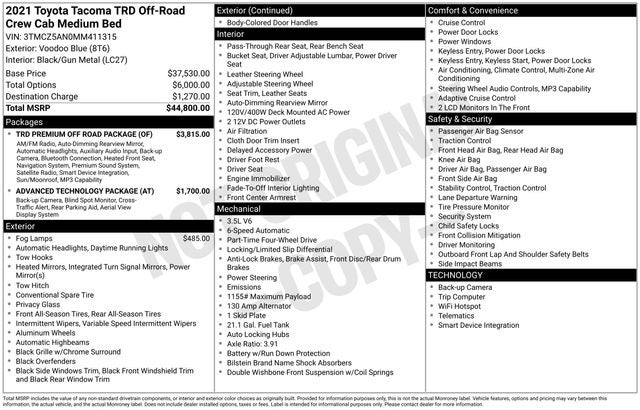 Clean CARFAX. Voodoo Blue 2021 Toyota Tacoma TRD Off-Road V6 3.5L V6 PDI DOHC 24V LEV3-ULEV70 278hp 6-Speed Automatic 4WD