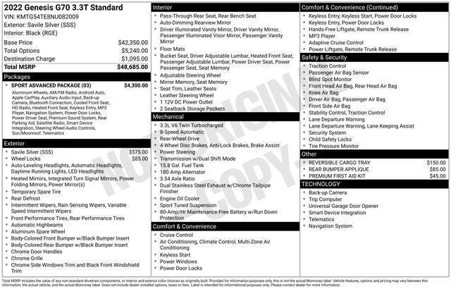 - Radio: AM/FM/SiriusXM/HD Audio System -inc: 6 speakers including subwoofer, 6 channel internal amplifier, speed-sensing auto volume control, 5th generation navigation system w/10.25" touchscreen, dynamic voice recognition, connected routing, over the air updates, Android Auto and Apple CarPlay, Bluetooth® hands-free phone system, steering wheel audio, cruise and phone controls, USB front and Genesis Connected Services