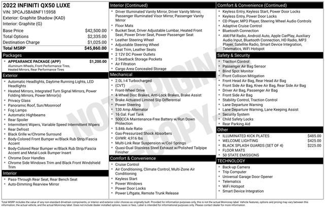 - Radio: HD Audio System -inc: INFINITI InTouch, INFINITI InTouch services, INFINITI InTouch dual display system w/upper 8" and lower 7" HD touch screens, wireless Apple CarPlay, Android Auto, SiriusXM radio w/advanced audio features and 90-day complimentary trial, INFINITI voice recognition, Siri Eyes Free, Wi-Fi hotspot and active noise cancellation