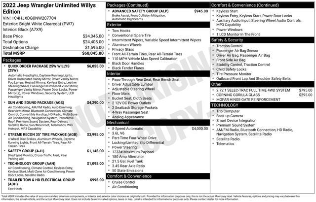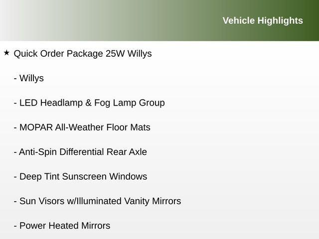 115V Auxiliary Power Outlet, 35 Tire Suspension, 4-Wheel Drive Swing Gate Decal, 4.56 Rear Axle Ratio, 8.4 Radio & Premium Audio Group, 97 MPH Vehicle Max Speed Calibration, Advanced Brake Assist, Advanced Safety Group, Anti-Lock 4-Wheel Disc Perf Brakes, Anti-Spin Differential Rear Axle, Auto High Beam Headlamp Control, Automatic Headlamps, Black Grille, Black Trail Rated Badge, Cold Weather Group, Console Bin Task Light, Convenience Group, Dana M210 Wide HD Tube Front Axle, Dana M220 Wide Rear Axle, Deep Tint Sunscreen Windows, Front 1-Touch Down Power Windows, Full Speed Forward Collision Warning Plus, Heated Front Seats, Heated Steering Wheel, Injection Molded Black Rear Bumper, Leather Wrapped Steering Wheel, LED Headlamp & Fog Lamp Group, Matte Black Jeep Badge, Media Hub-2 USBS (Both Charge Only), Mold In Color Bumper w/Gloss Black, Molded in Color Rubicon Highline Flare, MOPAR All-Weather Floor Mats, MOPAR Hinge-Gate Reinforcement, Power Heated Mirrors, Power Top Quarter Window Storage Bag, Quick Order Package 25W Willys, Rear Window Defroster, Rear Window Wiper/Washer, Remote Keyless Entry, Remote USB Port - Charge Only, Removable Rear Quarter Windows, Security Alarm, Sky 1-Touch Power Top, Speed Sensitive Power Locks, Sun and Sound Package, Sun Visors w/Illuminated Vanity Mirrors, Universal Garage Door Opener, Wheel Flare Extensions, Wheels: 17 x 7.5 Moab Black Aluminum, Wheels: 17 x 8 Beadlock Capable, Willys, Willys Hood Decal, Xtreme Recon 35 Tire Package.