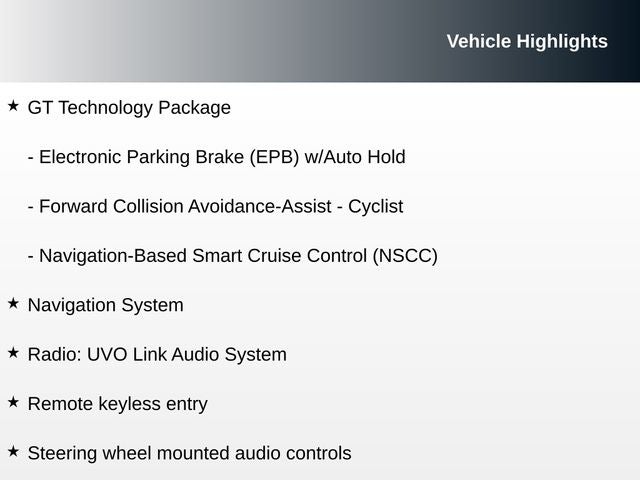 • GT Technology Package: Includes Navigation-Based Smart Cruise Control (NSCC), Electronic Parking Brake (EPB) w/Auto Hold, Forward Collision Avoidance-Assist - Cyclist