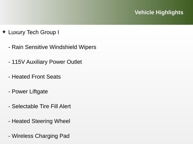 115V Auxiliary Power Outlet, Heated Front Seats, Heated Steering Wheel, Luxury Tech Group I, Power Liftgate, Rain Sensitive Windshield Wipers, Remote Start System, Selectable Tire Fill Alert, Wireless Charging Pad.