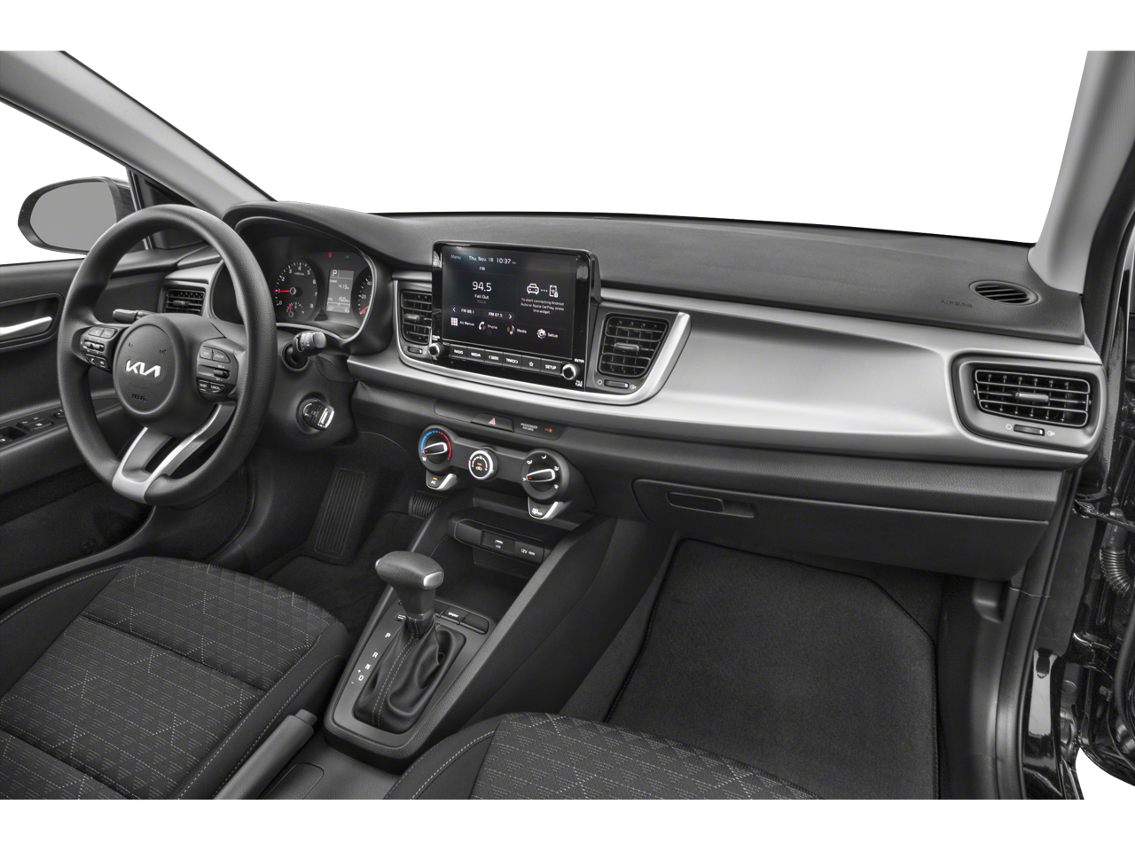 Step inside the 2023 Kia Rio S and discover a cabin that prioritizes your comfort and convenience. The spacious interior, with its Woven & Tricot Cloth Seat Trim, Front Center Armrest, and Split Folding Rear Seat, offers ample room for you and your passengers to enjoy the ride. The intuitive layout of the dashboard, complete with an Overhead Console and Tachometer, ensures you stay informed and in control behind the wheel.
