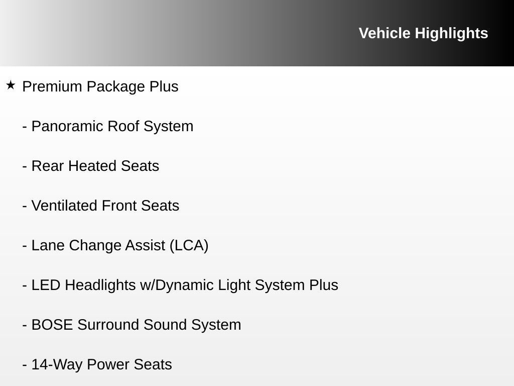 14-Way Power Seats, ABS brakes, Active Cruise Control, Alloy wheels, BOSE Surround Sound System, Electronic Stability Control, Front dual zone A/C, Heated door mirrors, Heated front seats, Illuminated entry, Lane Change Assist (LCA), LED Headlights w/Dynamic Light System Plus, Low tire pressure warning, Navigation System, Panoramic Roof System, Porsche Communication Management, Power Liftgate, Premium Package Plus, Rear Heated Seats, Remote keyless entry, Traction control, Ventilated Front Seats.