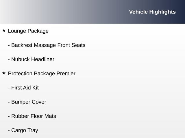 - Lounge Package with Nubuck Headliner and Backrest Massage Front Seats