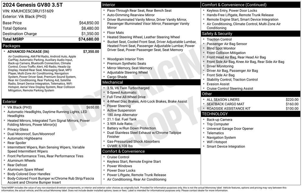 CARFAX One-Owner. Clean CARFAX. Vik Black 2024 Genesis GV80 3.5T 3.5L DOHC 8-Speed Automatic AWD