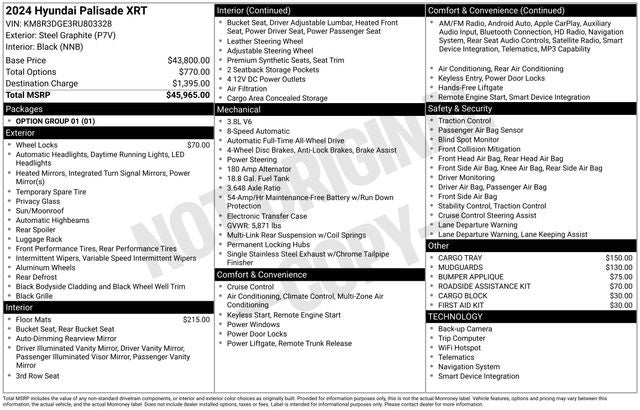 Steel Graphite 2024 Hyundai Palisade XRT AWD 8-Speed Automatic with SHIFTRONIC V6 WE DELIVER ANYWHERE, Option Group 01, 3.648 Axle Ratio, 3rd row seats: split-bench, 4-Wheel Disc Brakes, 6 Speakers, ABS brakes, Air Conditioning, Alloy wheels, AM/FM radio: SiriusXM, Apple CarPlay & Android Auto, Auto High-beam Headlights, Auto-dimming door mirrors, Auto-dimming Rear-View mirror, Auto-leveling suspension, Automatic temperature control, Brake assist, Bumper Applique, Bumpers: body-color, Cargo Block, Cargo Tray, Carpeted Floor Mats, Delay-off headlights, Driver door bin, Driver vanity mirror, Dual front impact airbags, Dual front side impact airbags, Electronic Stability Control, Emergency communication system, Exterior Parking Camera Rear, First Aid Kit, Four wheel independent suspension, Front anti-roll bar, Front Bucket Seats, Front Center Armrest, Front dual zone A/C, Front reading lights, Fully automatic headlights, H-Tex Leatherette Seat Trim, Heated door mirrors, Heated Front Bucket Seats, Heated front seats, Illuminated entry, Knee airbag, Low tire pressure warning, Mudguards, Navigation System, Occupant sensing airbag, Outside temperature display, Overhead airbag, Overhead console, Panic alarm, Passenger door bin, Passenger vanity mirror, Power door mirrors, Power driver seat, Power Liftgate, Power moonroof, Power passenger seat, Power steering, Power windows, Radio data system, Radio: AM/FM/MP3 Audio System, Rear air conditioning, Rear anti-roll bar, Rear audio controls, Rear reading lights, Rear side impact airbag, Rear window defroster, Rear window wiper, Reclining 3rd row seat, Remote keyless entry, Roadside Assistance Kit, Roof rack, Security system, Speed control, Speed-sensing steering, Split folding rear seat, Spoiler, Steering wheel mounted audio controls, Tachometer, Telescoping steering wheel, Tilt steering wheel, Traction control, Trip computer, Turn signal indicator mirrors, Variably intermittent wipers, Wheel Locks, Wheels: 20 x 7.5J Dark Alloy w/Rugged Styling, Option Group 01.