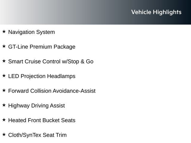 - GT-LINE PREMIUM PACKAGE: Includes Smart Cruise Control w/Stop & Go, LED Projection Headlamps, Highway Driving Assist, Forward Collision Avoidance-Assist, cyclist and junction turning