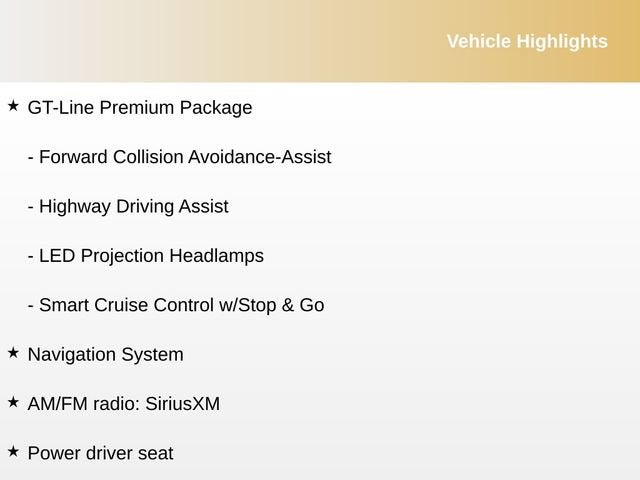 • GT-LINE PREMIUM PACKAGE: Includes Smart Cruise Control w/Stop & Go, LED Projection Headlamps, Highway Driving Assist, Forward Collision Avoidance-Assist, cyclist and junction turning