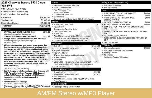 Discover the power, versatility, and convenience of the 2025 Chevrolet Express 3500 Work Van Cargo. Experience the difference a well-equipped, hardworking van can make in your daily operations. Visit our showroom today and let us demonstrate how this exceptional vehicle can elevate your business to new heights.