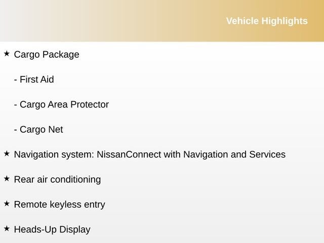 - NissanConnect w/Navigation & Services -inc: door to door connected navigation w/3D building graphics, satellite imagery, online POI search, online premium traffic information and SiriusXM Traffic and Travel Link w/weather, fuel prices, movie listings, stock info, sports and parking